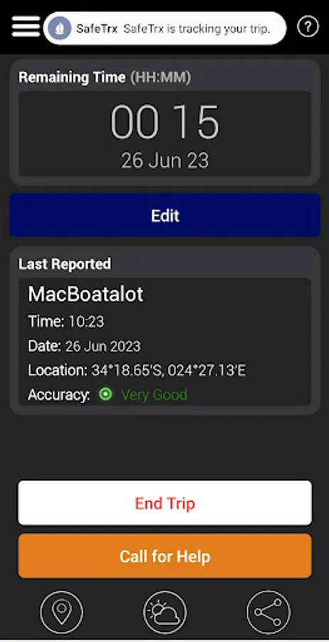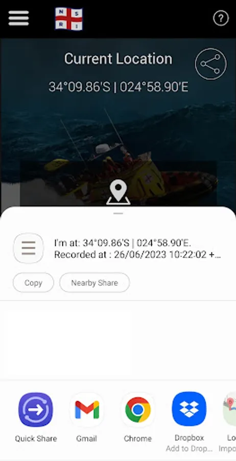 Pressing ‘set sail’ will register the journey details with NSRI’s computer server and will activate position reporting in the app. At regular intervals the app will send a position report to the server and your emergency contacts will be automatically alerted after the journey exceeds the ETA.