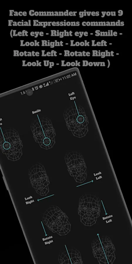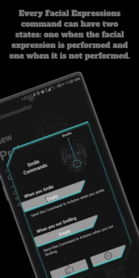 Face Commander Arduino and ESP32 Bluetooth Controller provide 9 commands for Facial Expressions (Left eye - Right eye - Smile - Look Right - Look Left - Rotate Left - Rotate Right - Look Up - Look Down ) Every Facial