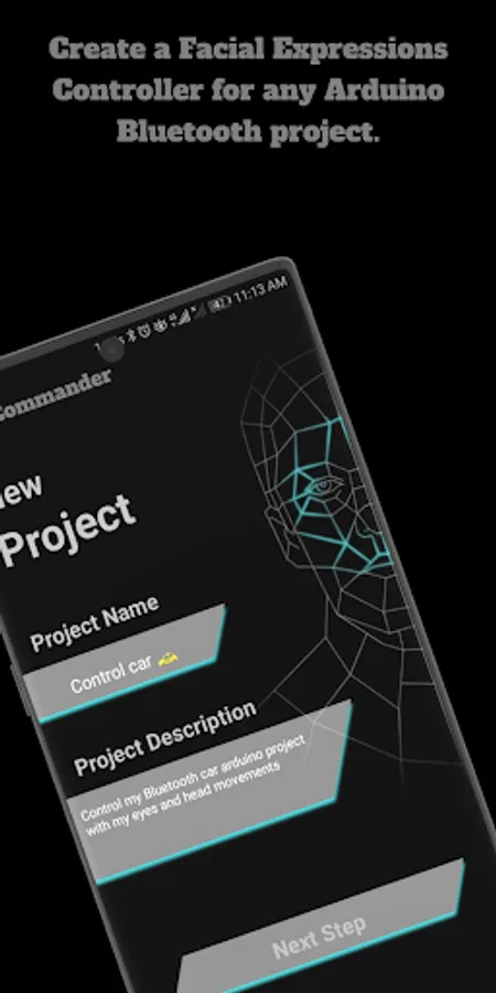 3- Select the New Project option. Face Commander Bluetooth Controller will now launch a new Activity to enter the new Project name and description.