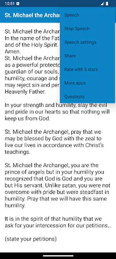 The app contains prayer to St. Michael, prayer for healing, Litany, Act of Consecration, Chaplet and novena to this powerful angel.