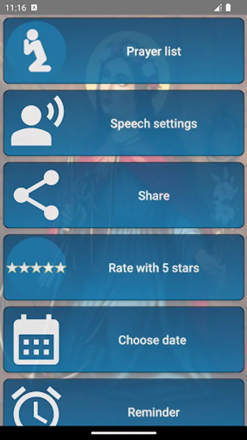 There is also a Text to speech feature if you want to listen to the prayers instead of reading. You can adjust the size of the text. The app allows you to track how many days you have started to pray with this app if you wish to pray it daily. There is an option to set up a daily reminder, so that you will not forget to pray for example each day at three o'clock. I hope you will like the app and share it with your friends. You can check for more christian apps with the button more apps and if you have any questions, please read first through the linked FAQ Questions.