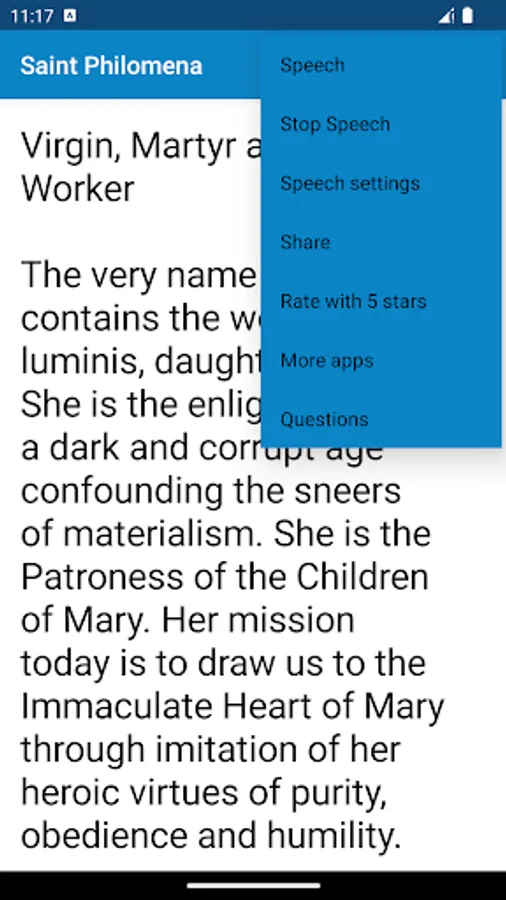 You can use this app to read about Saint Philomena's life and prayers like Novena, Devotion, Litanies to Saint Philomena and The Rosary in Honor of Saint Philomena.