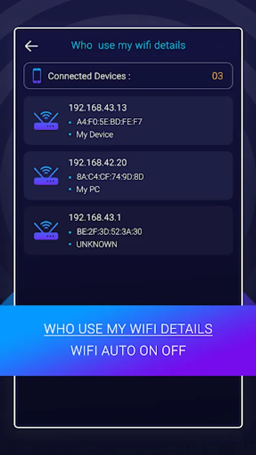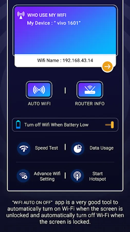 WiFi Automatic - WiFi Timer - WIFI Auto Scheduler app help your device auto Turn ON or turn OFF WIFI connection. This wifi automatic on-off wifi automatically to help your device save battery life and data internet connection. Most of the time device uses a battery to maintain the connection over WiFi even when the screen is off. So here we designed this WiFi Automatic - WiFi Timer - WIFI Auto Scheduler app to turn off your WiFi data connection if your screen is off or lock, and also when your screen is on or unlock it will automatically on the WiFi and data connection.