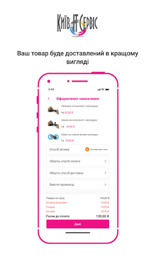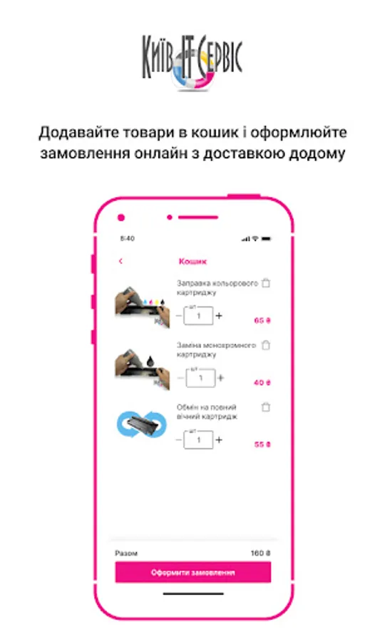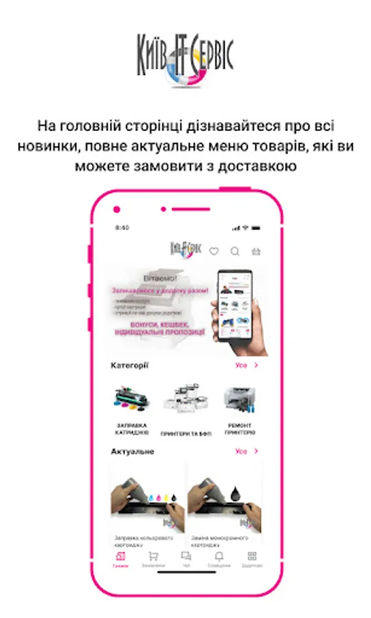 The mobile application "Kyiv IT Service" is your unique assistant with wide possibilities which will allow you to take care of the equipment with ease and essential economy. Thanks to the convenient interface you will be able to quickly find the necessary services or the goods which interest you in the catalog, to print qualitatively and uninterruptedly on the device. By installing our application, you will have a number of exceptional features and benefits, such as: