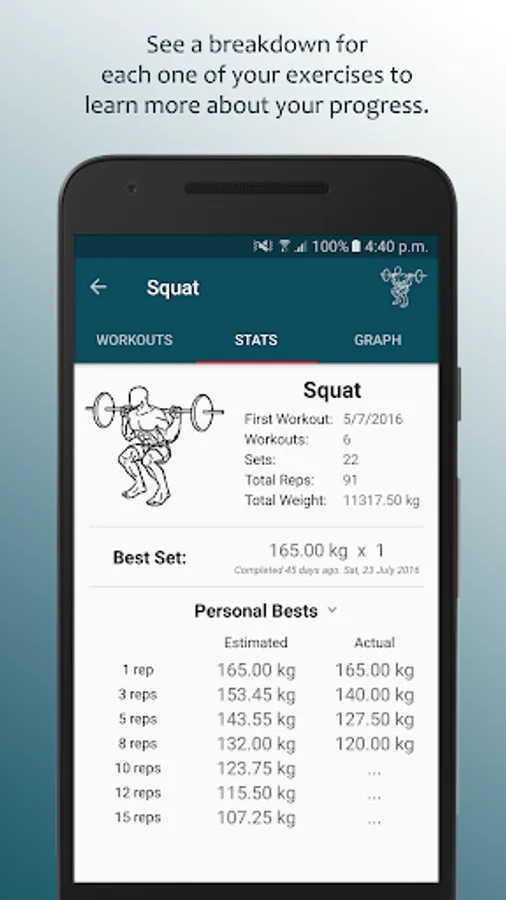 - Detailed stats page will tell you your best set, how many workouts you've had, your estimated one rep max and much more