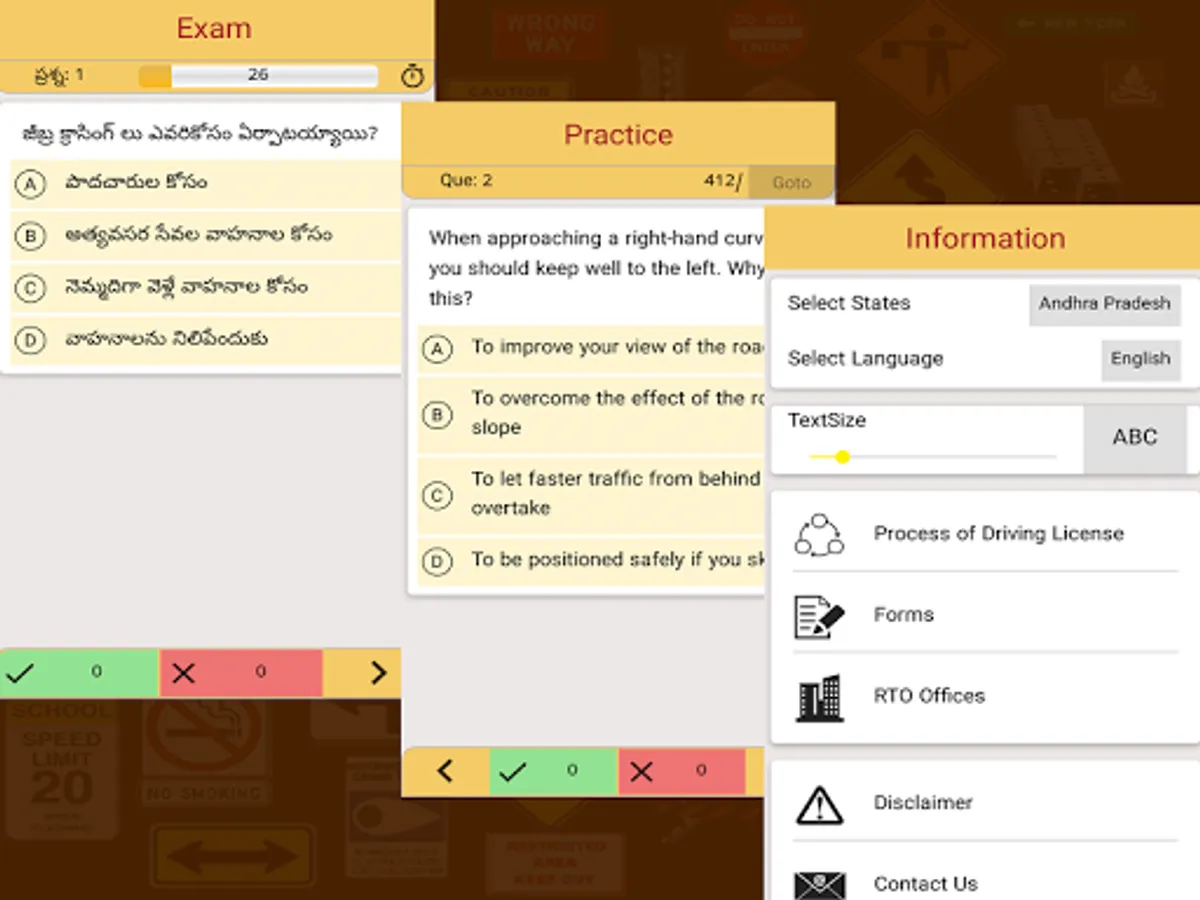 RTO Exam App is very useful to obtain driving license from RTO within Andhra Pradesh and Telangana, App is available in Telugu , Hindi and English language.
