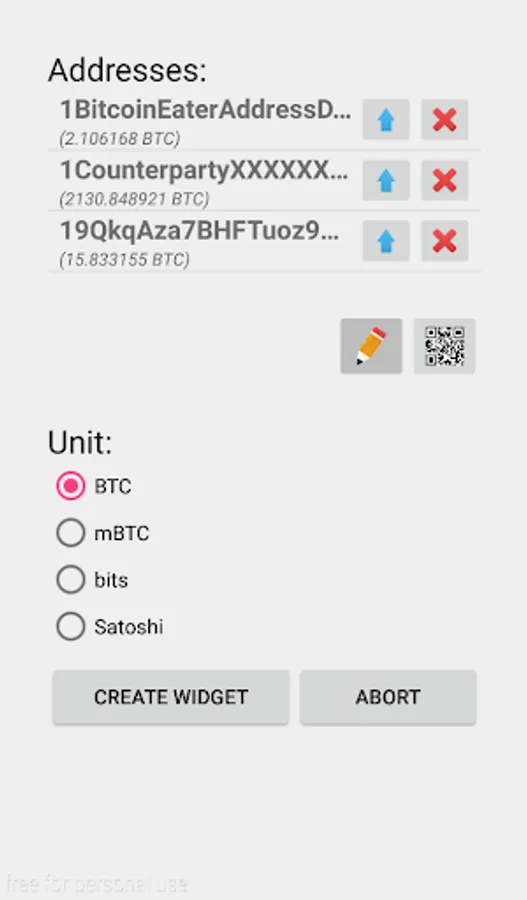 This widget displays the balance of one or more BTC address on your homescreen.
