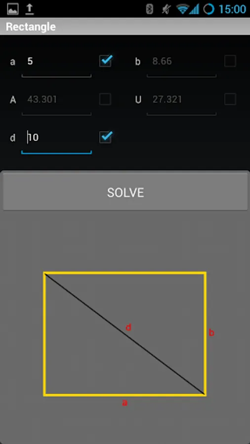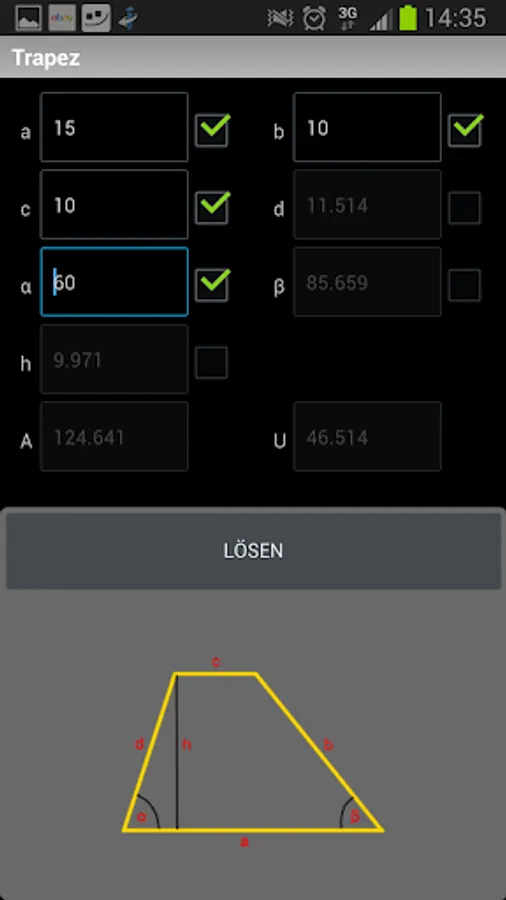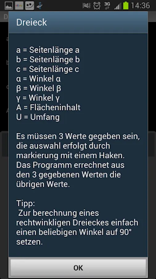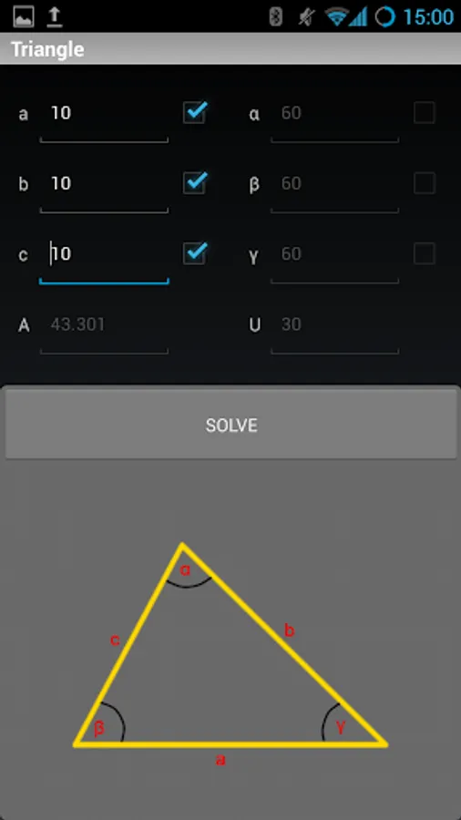 This requires the app any known values are given,e.g. the side lengths of a triangle. The app will now calculate the remnant values such as area and perimeter as well as the angles of the triangle.