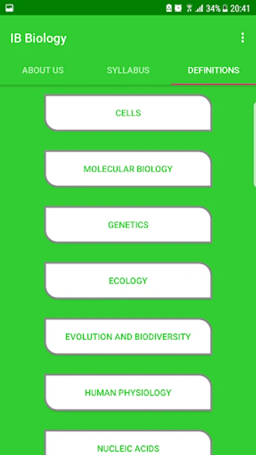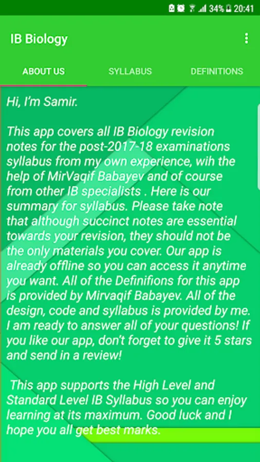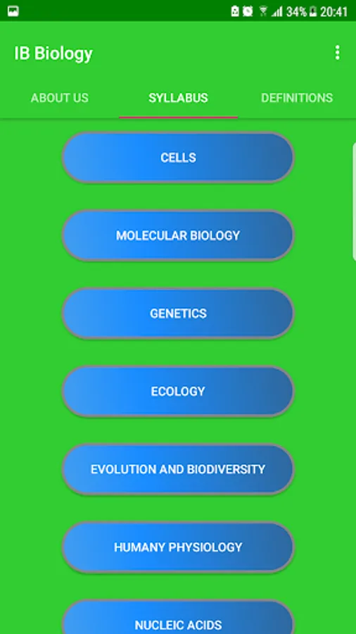 Very easy to use, free and education app that covers entire Biology Syllabus for 2017 with a lot Offline Information. It's for people who want to freshen their memories and bring back information that they have missed in class. It's cool when you can get all of IB Biology content with one click