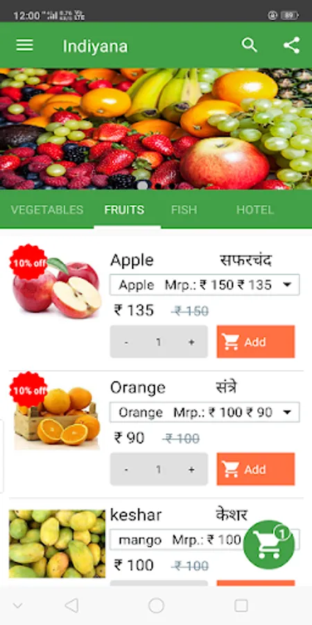 Shop Fresh Vegetables & Fruits online from Indiyana ! Doorstep vegetables & fruit delivery service in Malegaon city. Get fresh & hygienic vegetables, fruits & more at the best prices. Enjoy easy online vegetables & fruits shopping and home delivery at just a click of a button.