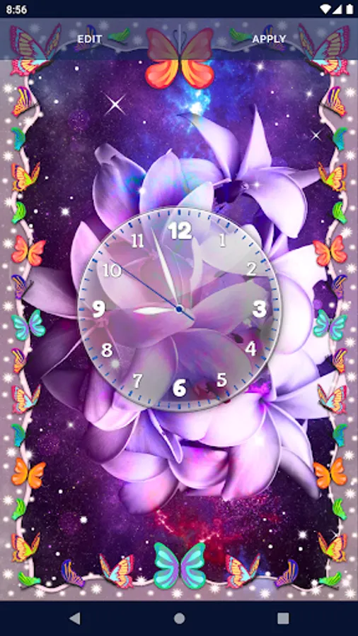 Live Wallpaper for Samsung - Colorful HD Themes has multiple 4K moving wallpapers with blue cloud and gold pattern images, purple flower backgrounds, rainbow colors HD wallpaper, multiple customize options like background changer, frames, animated sparkling stars, magic touch, analog clock, emoji, your name and more, that work on the lock screen and they are all FREE!
