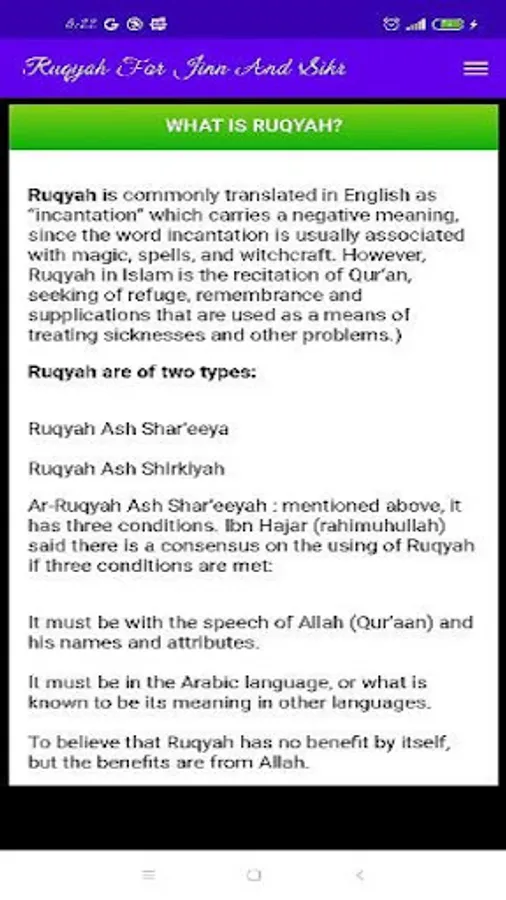 Ruqyah is generally translated in English as "mantra" which carries a negative meaning, because the word mantra is usually associated with sorcery, incantations, and sorcery. However, Ruqyah in Islam is the recitation of the Qur'an, seeking refuge, remembrance and supplication which is used as a tool to treat ailments and other problems.)
