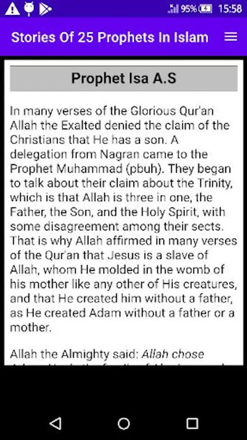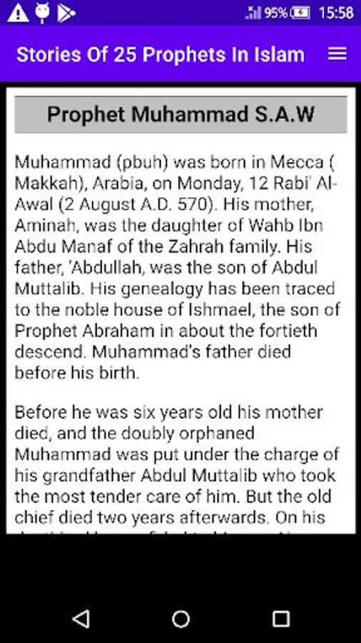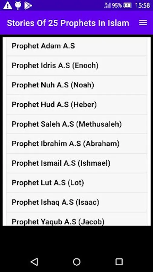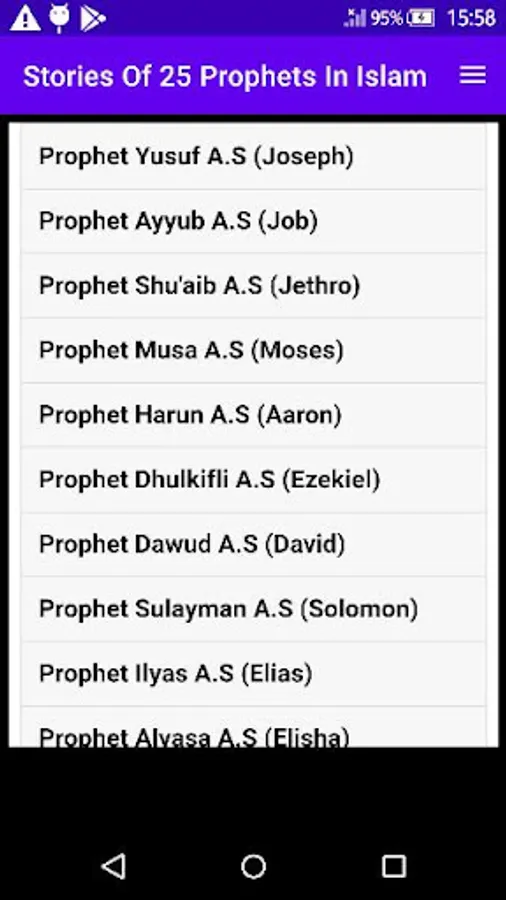 This application contains accounts of the prophets and couriers of Allah in spreading Islam, from the prophet Adam to the last prophet Muhammad SAW. His accounts give us an outline of the battle to maintain the reality of Islam which is brimming with snags from the unbelievers who go against the presence of the prophets and couriers however consistently lead to the triumph of Islam, a religion that is honored by Allah SWT. We can take exercises and models from his accounts with the goal that they can be an arrangement forever and inspiration in doing love to Allah. By becoming more acquainted with additional about these prophets and messengers, it is trusted that they will reinforce our confidence and solidarity to confront the impacts of this inexorably ruined period, if in the past they battled against the foe, presently we are battling against our interests. Ideally this application makes us people who are more submissive to love.