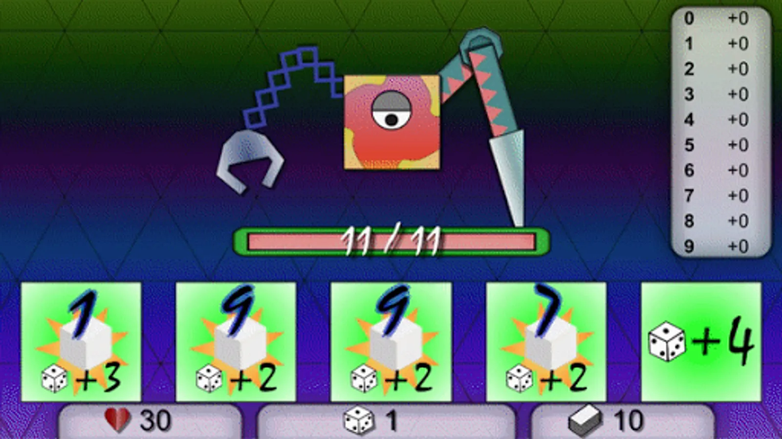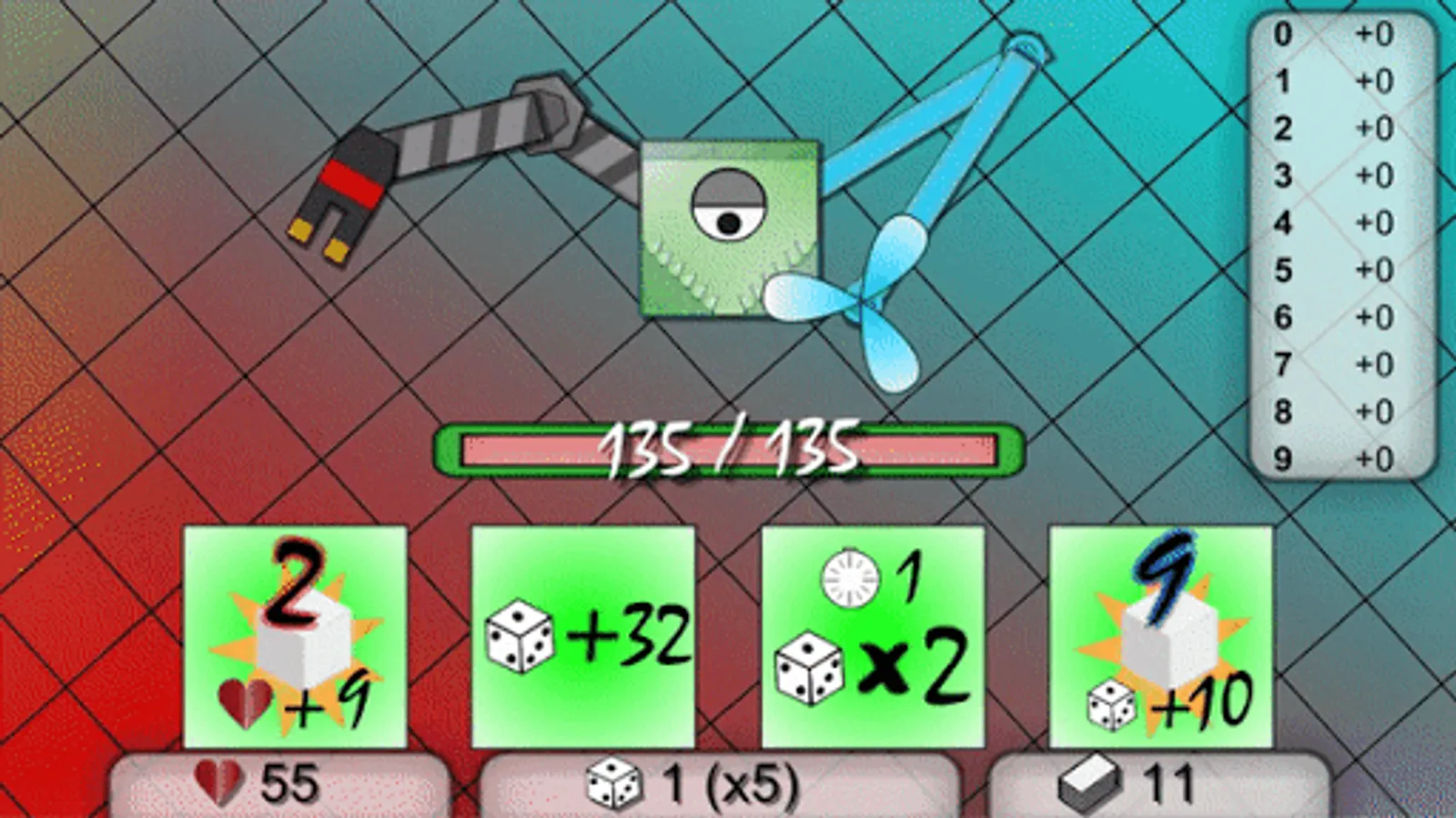 * Cards generated procedurally, with effects such as increasing your number of dice, forcing or forbidding certain rolls, or even altering the number of sides on the dice
