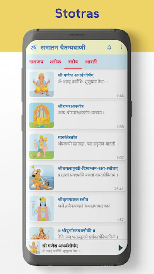 It gives us immense pleasure and pride to announce Sanatan Chaitanyavani App (Audio Player सनातन चैतन्यवाणी). This App is our humble offering to Sanatan Dharma (Hindu Dharma) in the endeavour of preserving and propagating our great heritage ! This app has the best rendition of Stotras, Shlokas and Aarti hymns! We are sure you will like it very much ! Download it today!