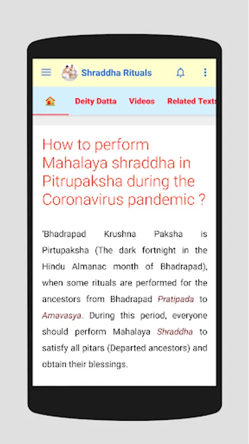 We present this app with the hope that all your How's and Why's of performing Shraddha, the importance of Mahalay Shraddha (Pitru Paksh) will be answered.