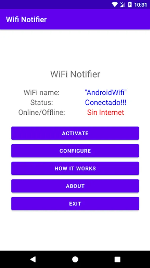 Sometimes the internet goes away and we must be checking the cell phone at all times in the hope that we already have internet access, this can take away some time to be checking the cell phone, Wifi Notifier will notify you when you already have internet, This way you do not waste time checking the cell phone at all times, also if you already have internet but you need to know when the internet is going to activate your mobile data, because Wifi Notifier not only alerts you when you already have internet, it also You can notify when you no longer have internet and in this way activate your Mobile data and continue with your activities.