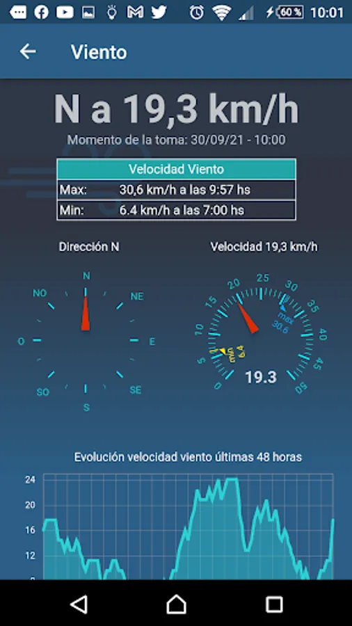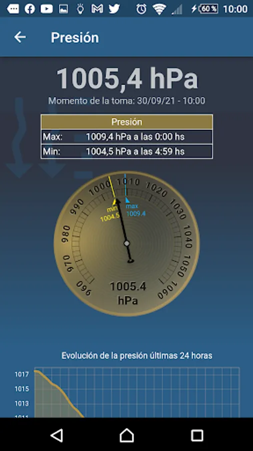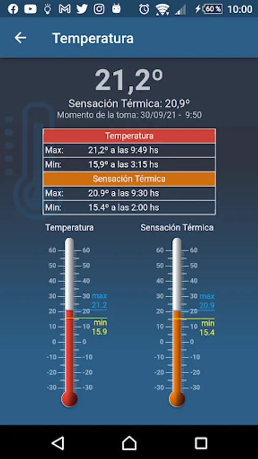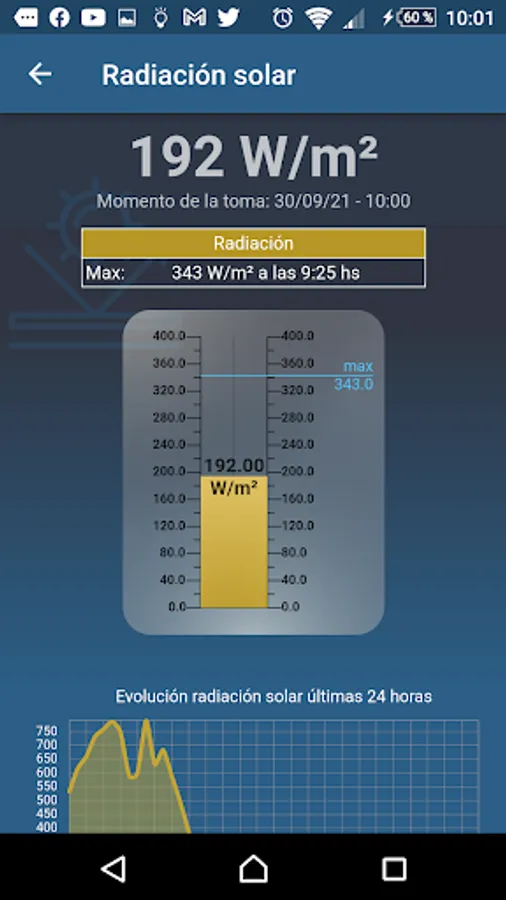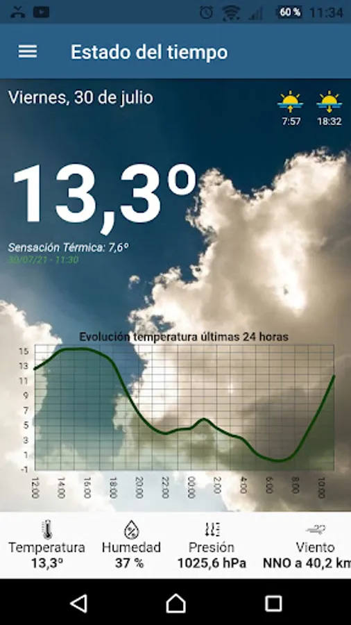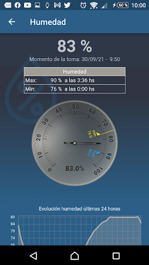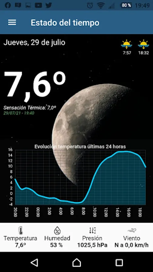 Among the data it displays are: Temperature, Thermal Sensation, Humidity, Pressure, Wind, Rain, Dew Point, Solar Radiation, Sunrise and Sunset, Moon Phases. Both the current value and the history of the last 24 hours are displayed.