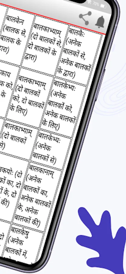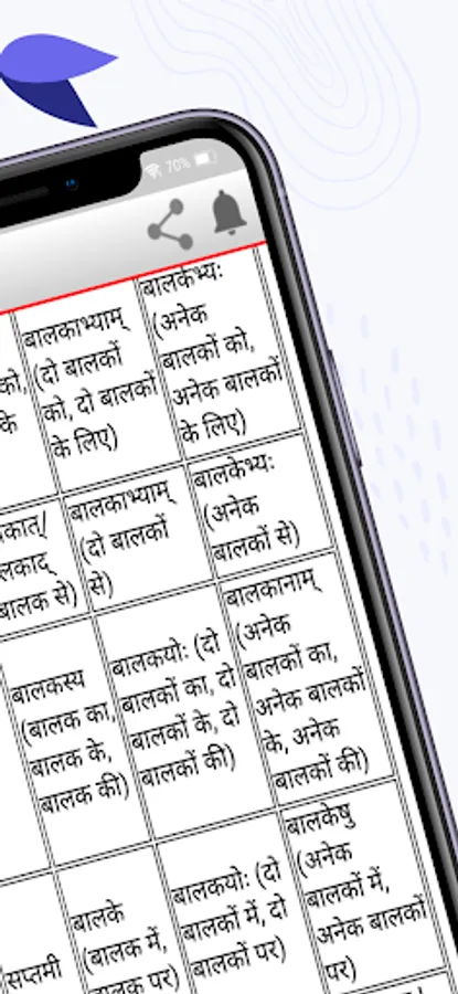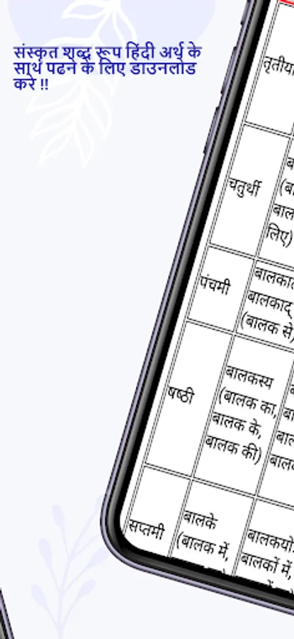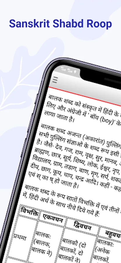 This app "Sanskrit Shabd Roop" is created with the purpose of educating students who want to learn Sanskrit. Here, we tried to add all important Sanskrit Shabd roop lists with Hindi meanings in all vibhaktis and vachans for classes 5 to 12 for all education board students.