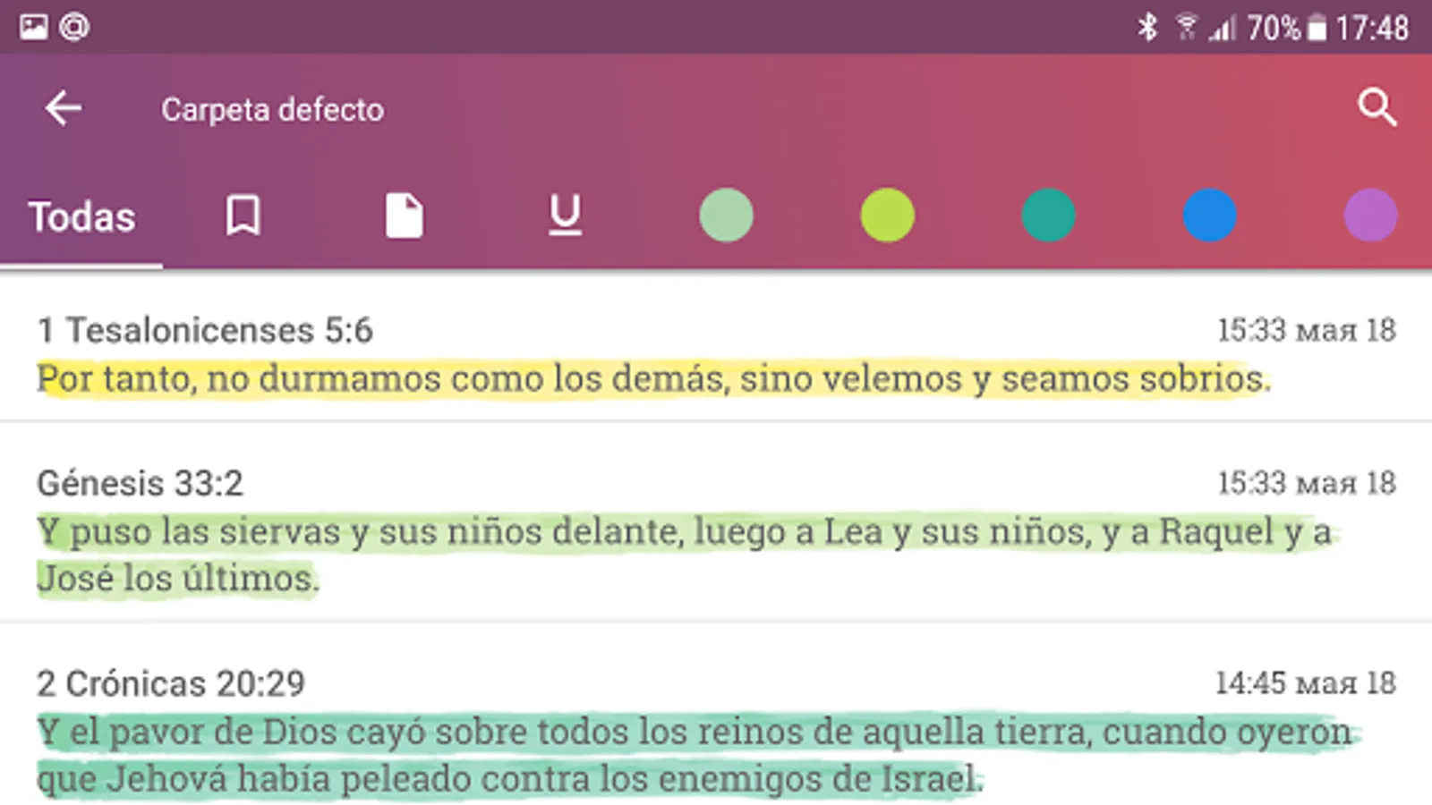 Simply touch the verse or select any part of the text. You can create your own folders to facilitate your study of the Holy Bible Reina Valera 1960!