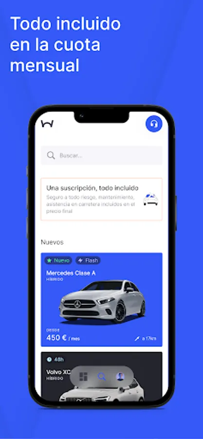 Wabi is the vehicle subscription adapted to you. A flexible mobility subscription, where you can choose the month-to-month duration that suits you best, from 30 days until you need it. Without penalties or permanence, enjoy a vehicle for months with everything included (comprehensive insurance, maintenance, roadside assistance, check-ups...). Download the app and do everything 100% online, without paperwork.