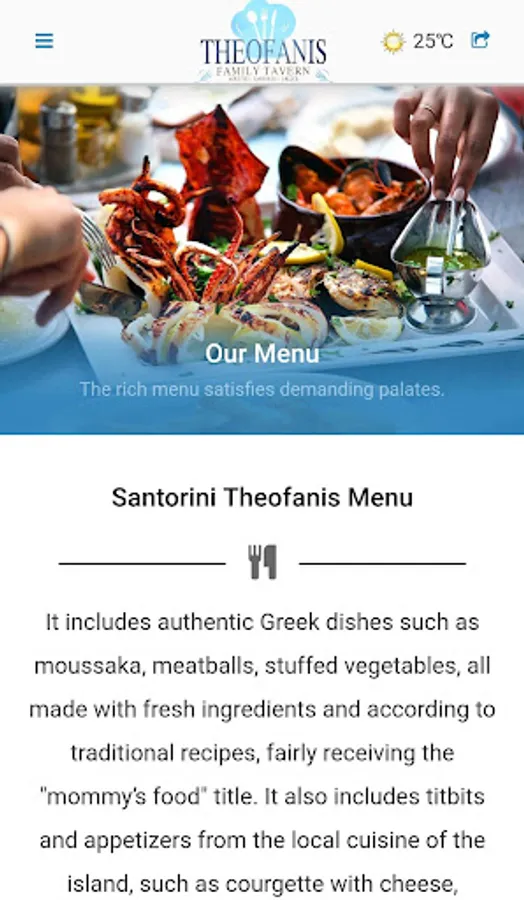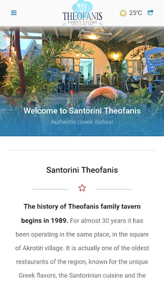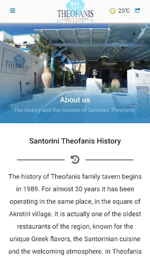 The history of Theofanis family tavern begins in 1989. For almost 30 years it has been operating in the same place, in the square of Akrotiri village. It is actually one of the oldest restaurants of the region, known for the unique Greek flavors, the Santorinian cuisine and the welcoming atmosphere.