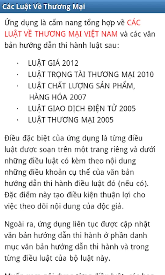 Want to see the content of each rule, you click on "THE LAW OF VIETNAM TRADE". The rule name is highlighted in red (if any) as are laws contain provisions specific guidance by the guiding text, written just below the content of it.
