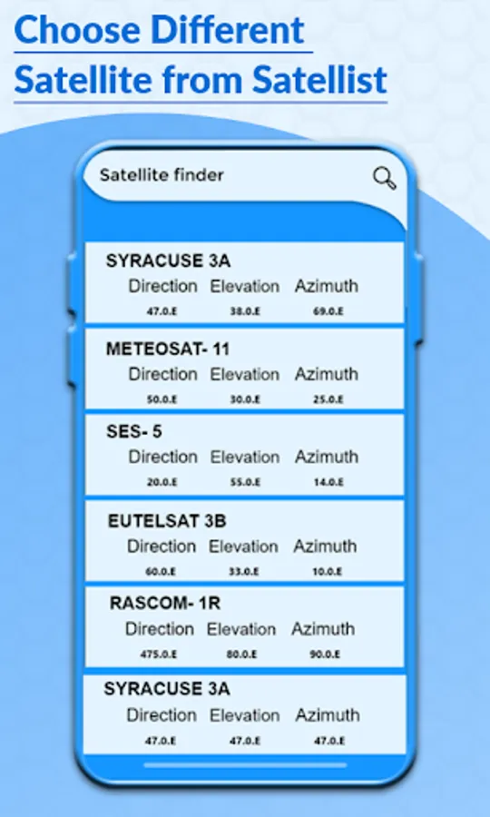 • You can use the ar technology as dish satellite finder, All the satellites are displayed on the satfinder lite screen with their values and you can easily select your desired satellite.