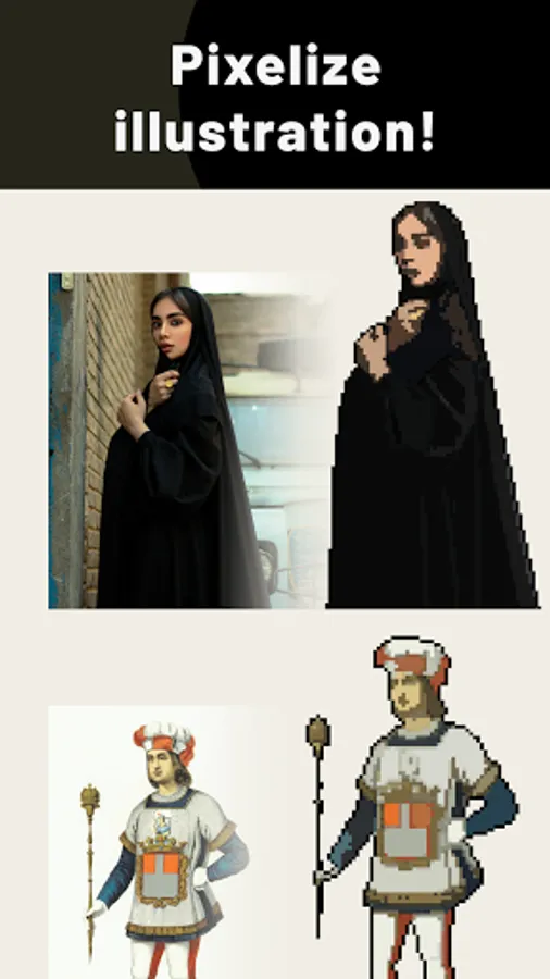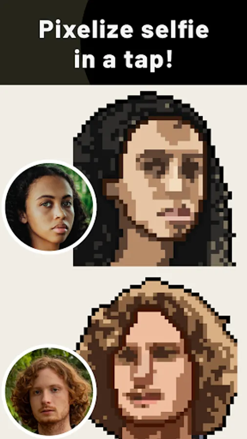 Convert photos into pixel art. PixelMe is a pixel art painting app. Easily make pixel art from your face, and then share your art.