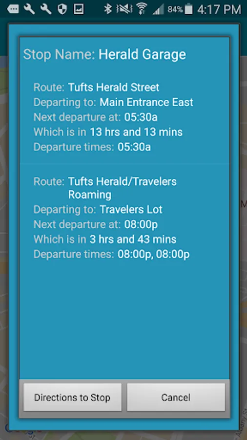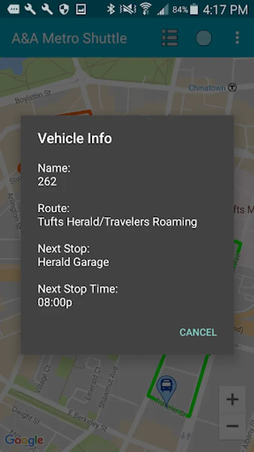Interactive map shows location of user, nearby stops and real-time location of shuttles.