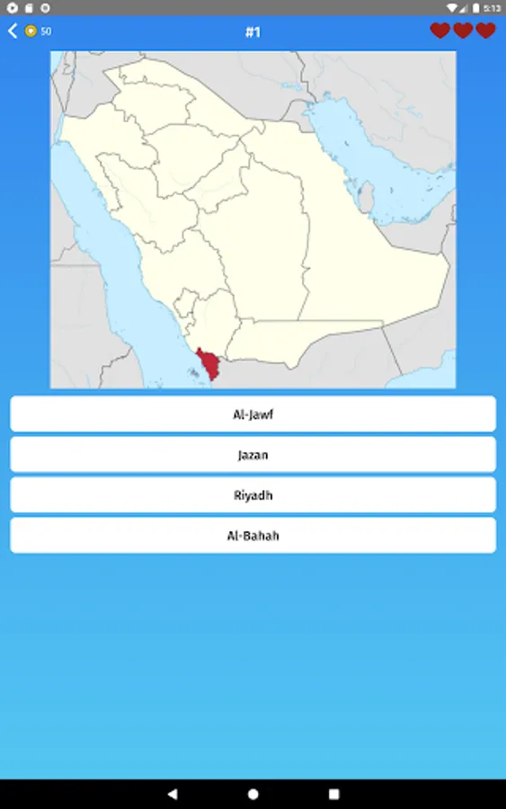 - Multiple choice: guess the provinces of Saudi Arabia, by selecting one of the variants.