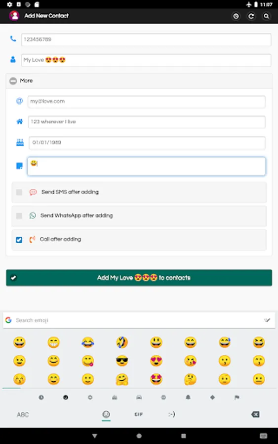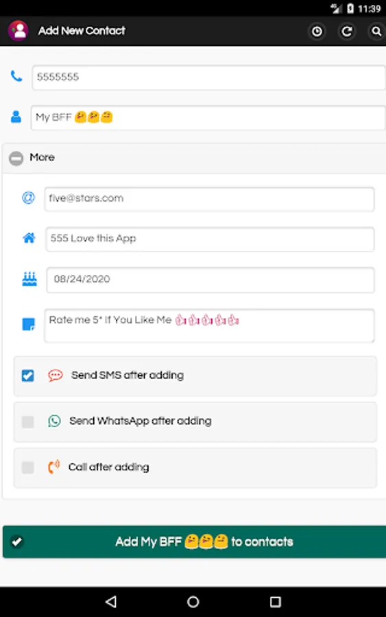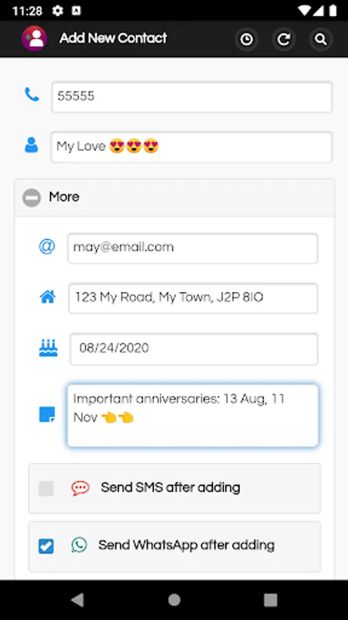 - Option to send SMS, WhatsApp or call to new contact after adding (so they get your number)