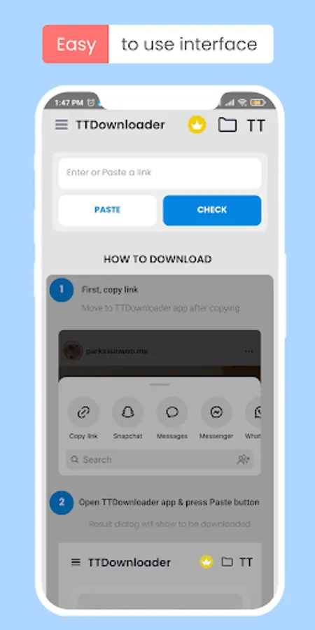 “TT Downloader: get all from TT” is a so good video downloader to download photo, video & audio without a WATERMARK. All that you need is a video link, and all the processing is done on our side so you can be one click away from downloading videos to your mobile. Very simple & quick, just copy the link of a video or a photo and then pasting into TT Downloader which automatically downloads that photo/video, and then you can save it to your device. Use our "TT Downloader: get all from TT" to download photos/videos/audios to your local gallery & view them offline & share them with friends to get more likes!