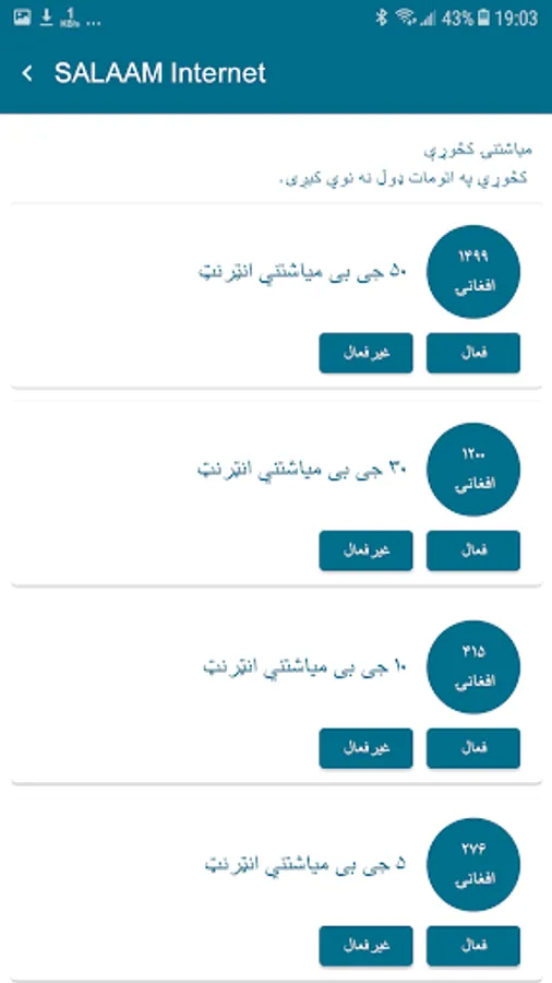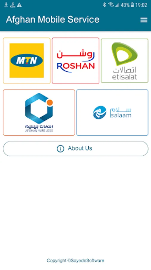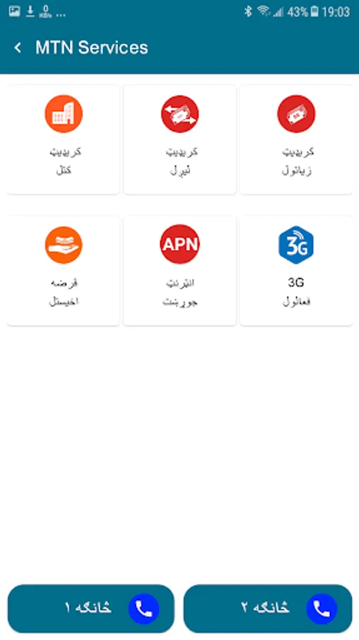 د (Afghan Mobile Services) اپليكېشن کې د پنځه سیم کارتونو د اتصالات، افغان بیسیم، ام ټی ان، روشن، او سلام، د وړانديزونو او اونټرنټ پیغامونو او د اړیکو بنډلو فعالولو لپاره اسانه لار برابره کړی