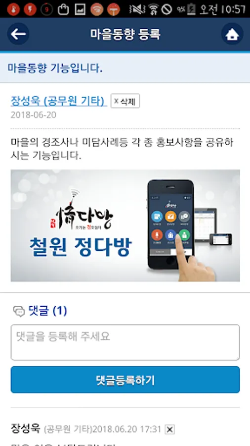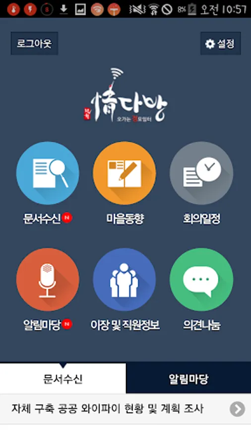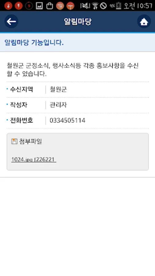 - 각 읍면동 또는 통리별로 알림 및 첨부파일들을 확인할 수 있습니다.