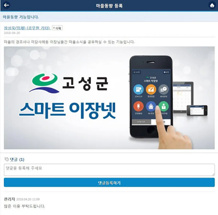 - 이장님들 간 자유로운 의견을 공유할 수 있는 공간이 제공됩니다.