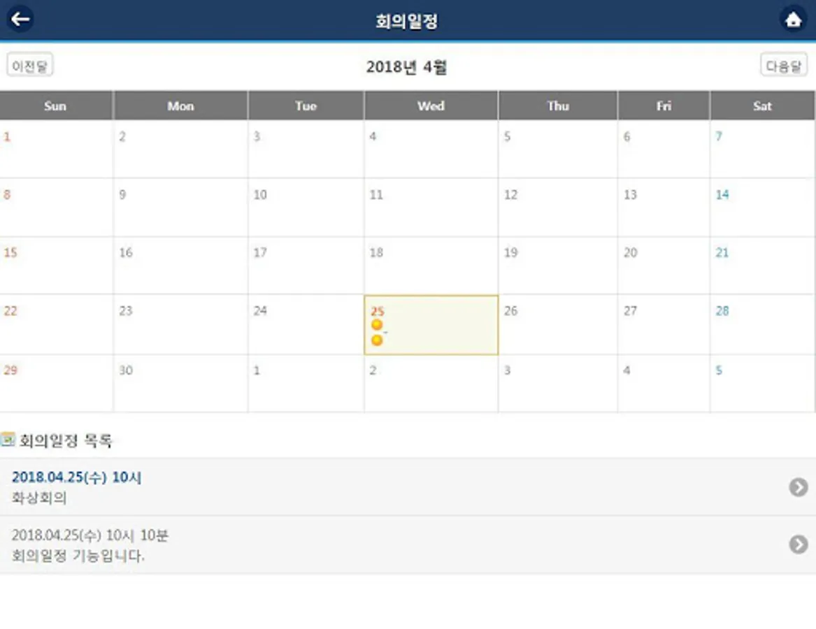 - 월별로 회의내용들을 확인할 수 있고, 회의에 참여 또는 미참여를 전송하여 회의에 필요한 내용들을 미리 준비할 수 있습니다.