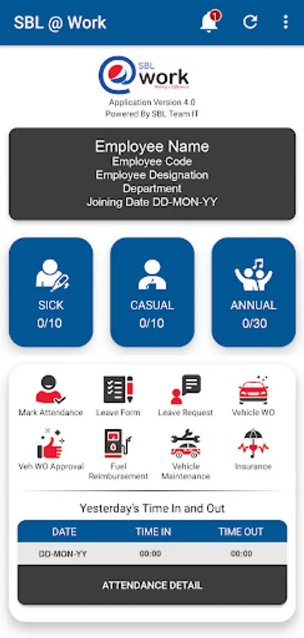 SBL@Work app provides users their basic information like designation, department, salary, leave balances, and monthly attendance, and monthly time in/time out detail. You can apply your leaves, short leaves, and half-day form SBL@Work app. You can check your leave status to determine at what stage your applied leave is at right now.