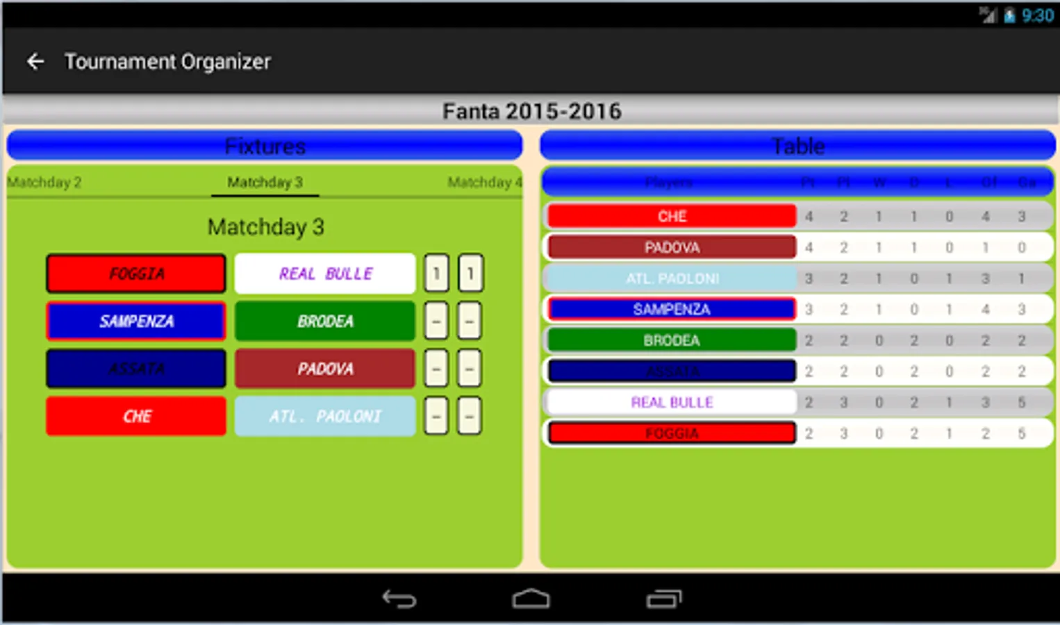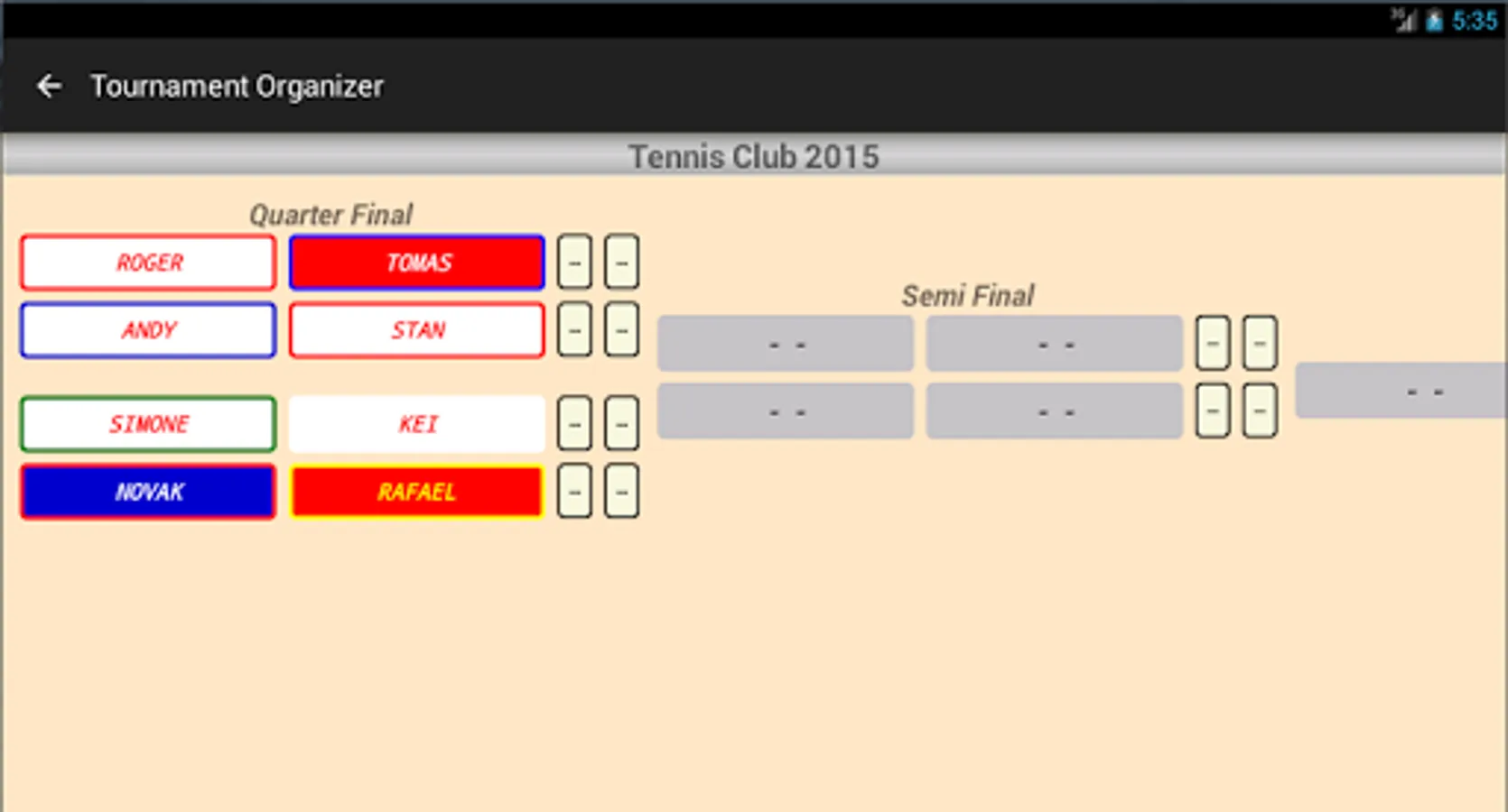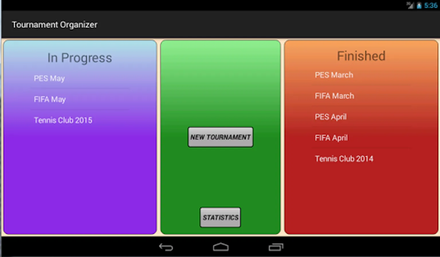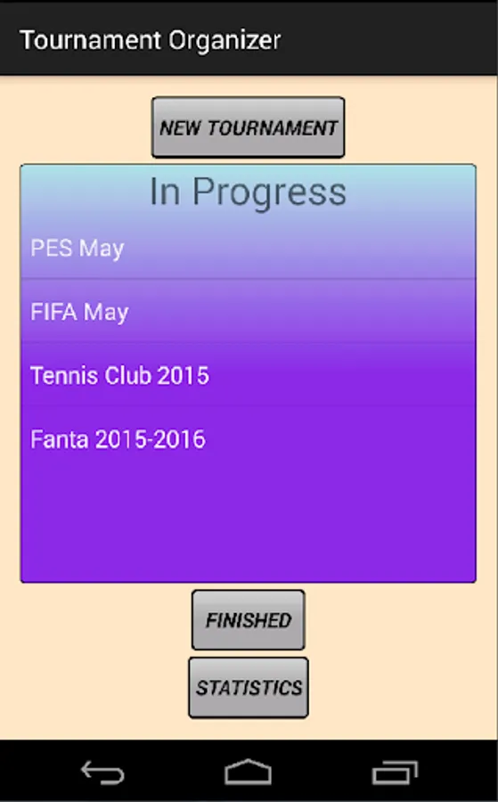 Tournament Organizer is a simple and intuitive APP which allows the management of Knockout tournaments and Round Robin leagues, Players customize and see their general statistics.