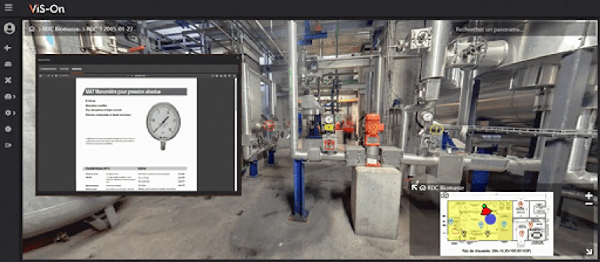 This digital twin is documented by the user autonomously, thanks to information points enriched with all types of multimedia content (photos, videos, PDF, internet links, etc.). It allows you to obtain contextual information (which depends on your profile) on equipment or rooms at the click of a button (risks, procedures, equipment status, adjustment standards, maintenance status, etc.). The VIS-On software makes it possible to group together a maximum of data, previously available in a multitude of different media (plans, operating procedures, photos, maps, tutorials, etc.), and therefore simplify access to information.