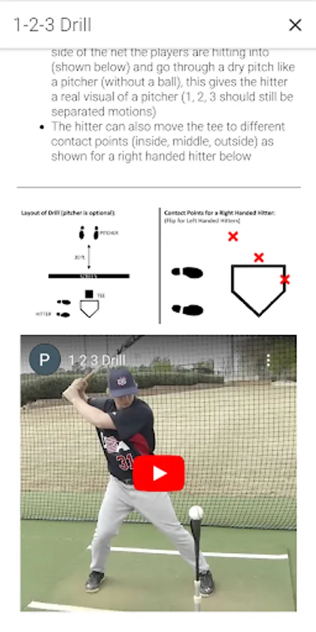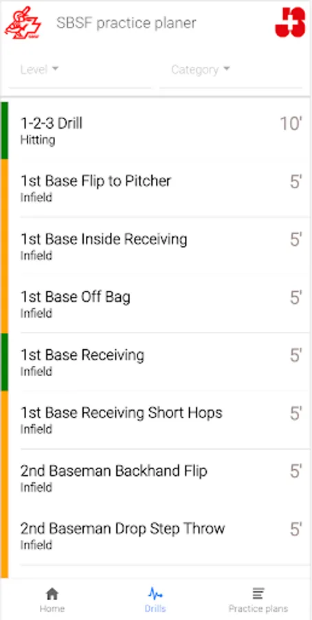 The drills are divided into different levels of difficulty and can also be filtered according to the type of training (pitching, hitting, outfield, etc.).