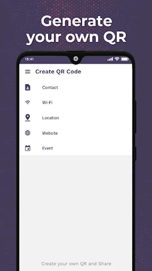 Select for what do you want to create QR Code - Contact, WiFi details, Location Details, Website address, Text or an event.