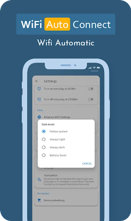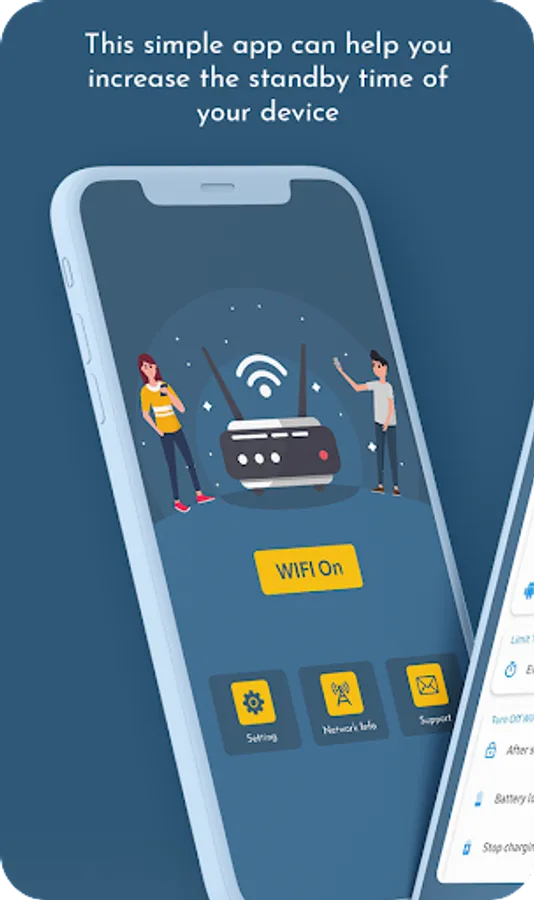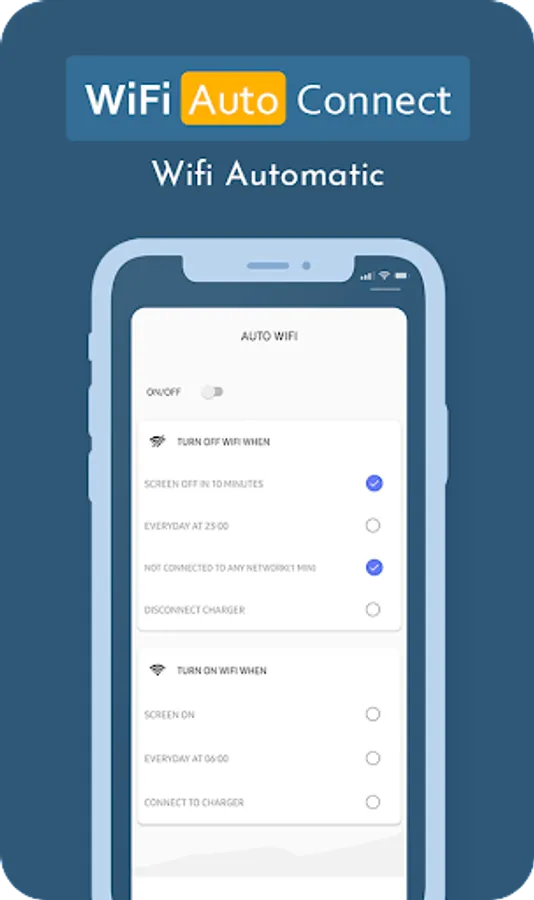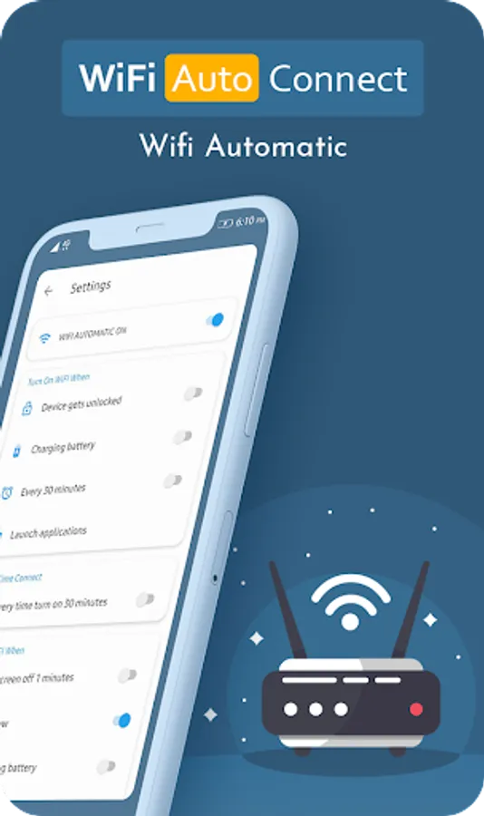 WiFi Automatic or Wi-Fi Auto Connect app can help you increase the standby time of your device. WiFi Automatic disable your WiFi Radio when you don't need it and thereby lowers the battery consumption. Wi-Fi Auto Connect app helps you Reconnect Wi-Fi and Auto Stop WiFi Connection, Mobile Hotspot automatic.