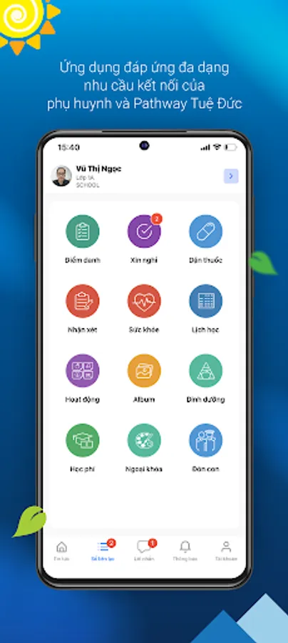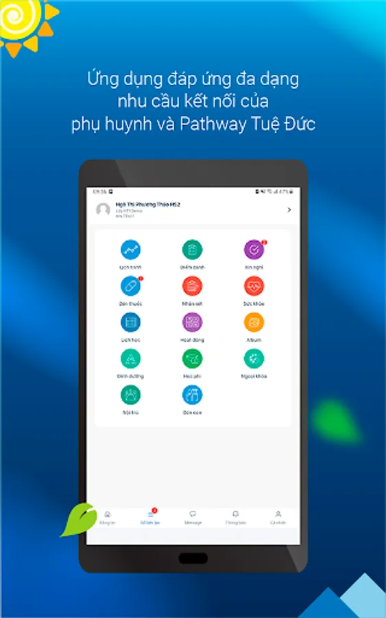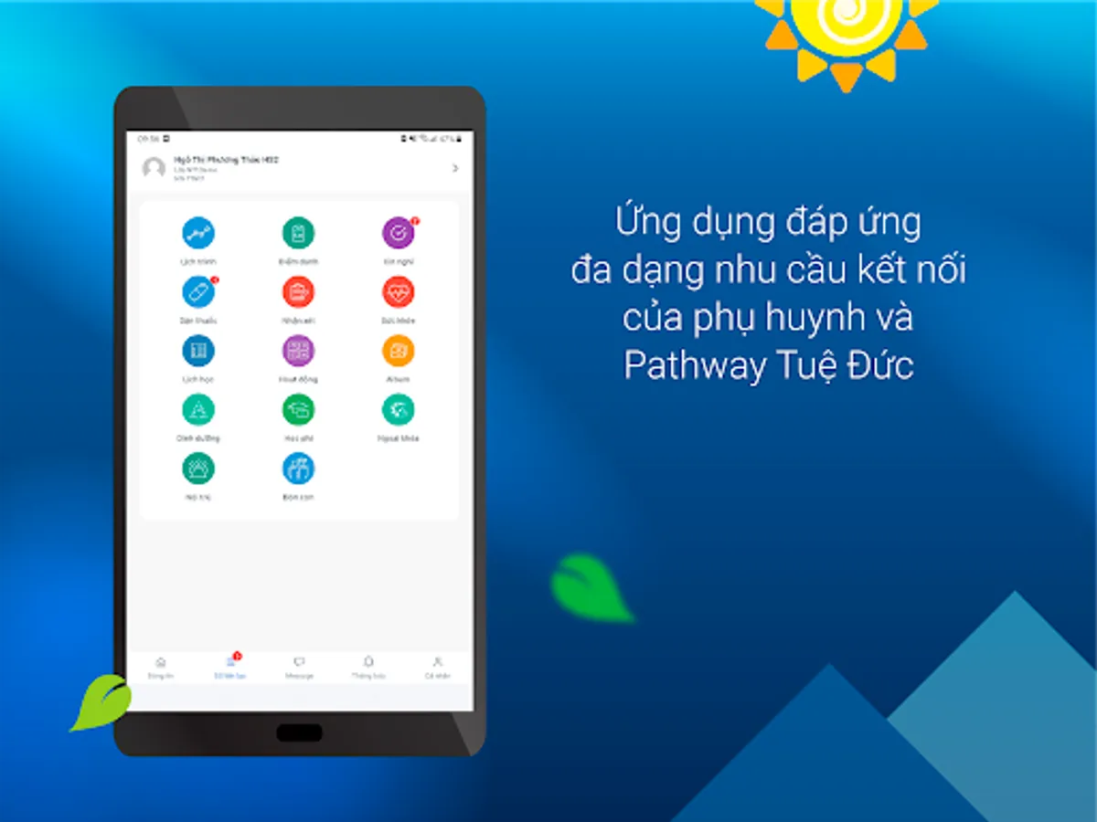 The application aims to create an official and quick connection channel between the Tue Duc Pathway School System and Parents; At the same time, this is also an effective tool to help the Board of Directors and teachers optimize work efficiency. The application includes the following main features: