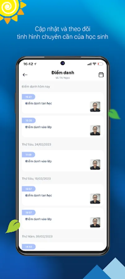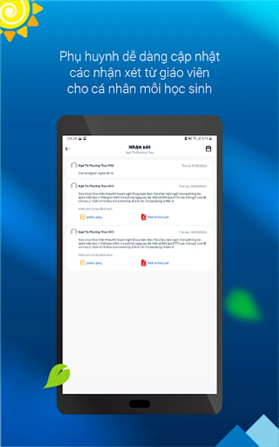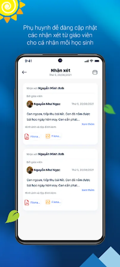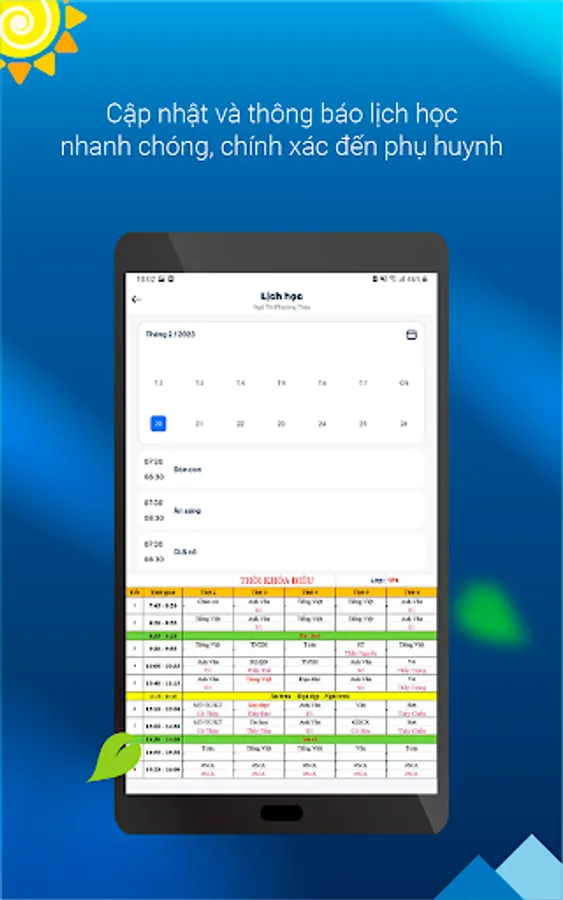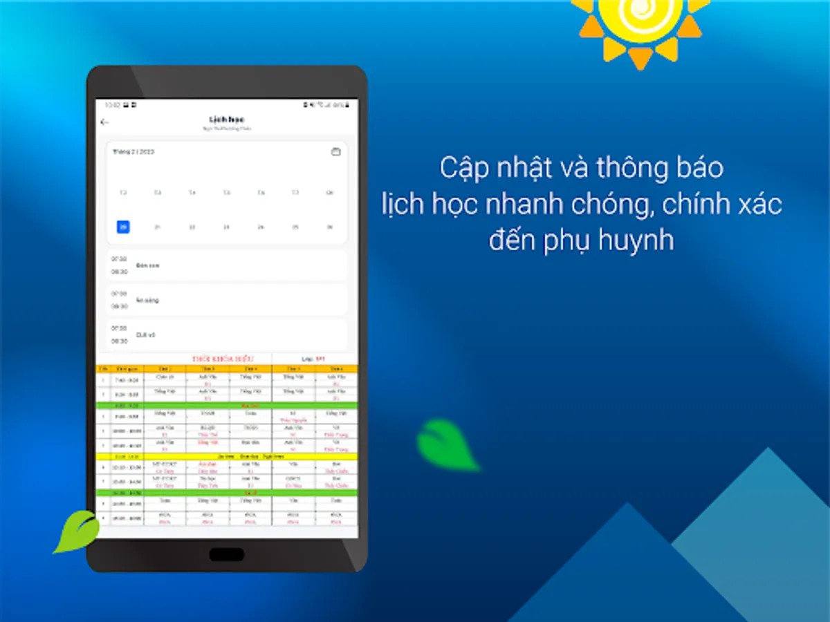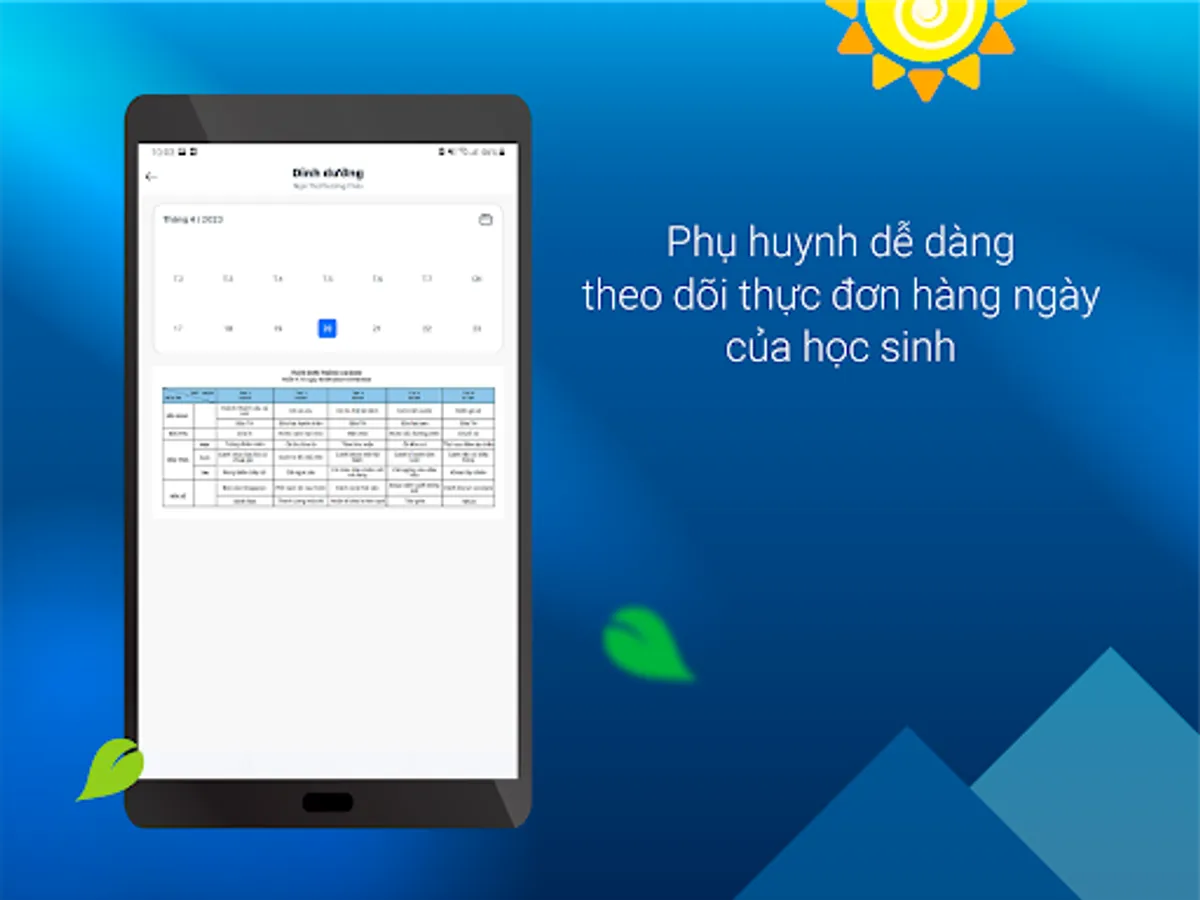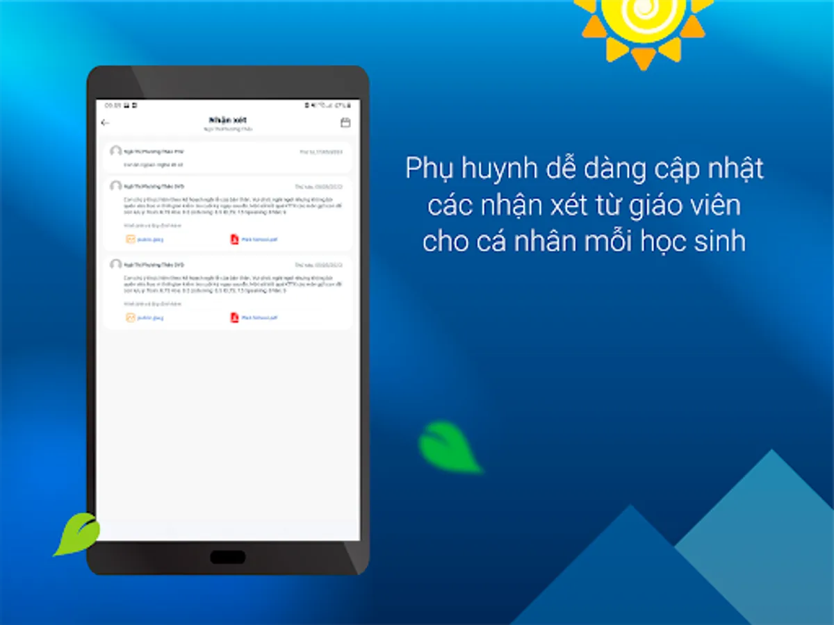 - Electronic contact book: Continuously and timely update information related to the student's learning process such as attendance, daily menu, health information, leave application, medication advice, comments , daily activities, photo album, tuition tracking, registration for extracurricular classes/books/uniforms.