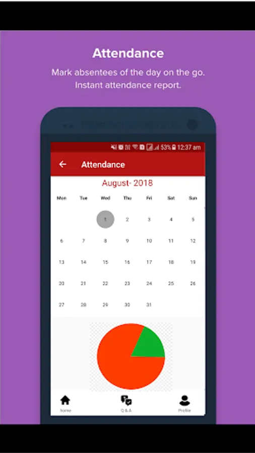 Attendance Report : You will be notified instantly, when you kid is marked absent for a day or class. Attendance report for the academic year is available readily with all the details.
