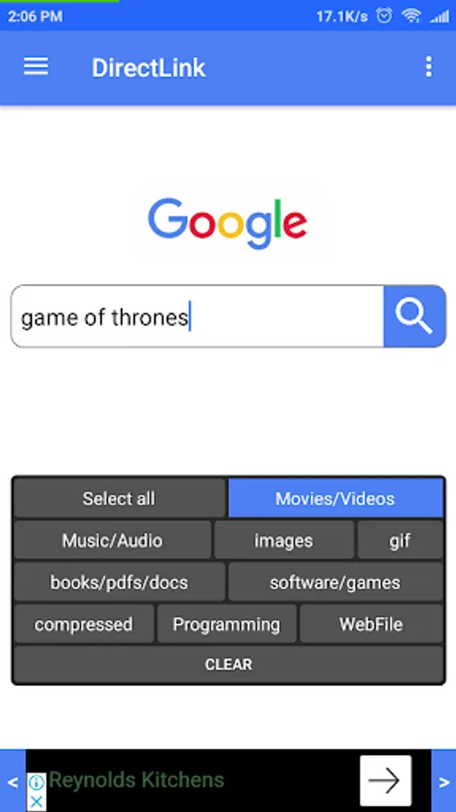 Our App provides links to Direct Download from the Internet. It supports formats for videos , audios, documents and softwares.