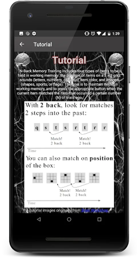 The object of the game is to hold various items in your working memory and actively update these items as the game progresses. With each new trial, press the match button if the current item matches the item that occurred a given number of trials in the past. The term “n-back” denotes how many trials (n) in the past you need to remember. By default, you will begin on 2-back, so press the match button if the current item matches the item that occurred 2 trials back in the past. For a simple demonstration of how to play single 2-back, see this video: https://www.youtube.com/watch?v=qSPOjA2rR0M .