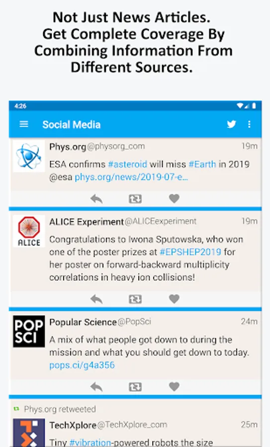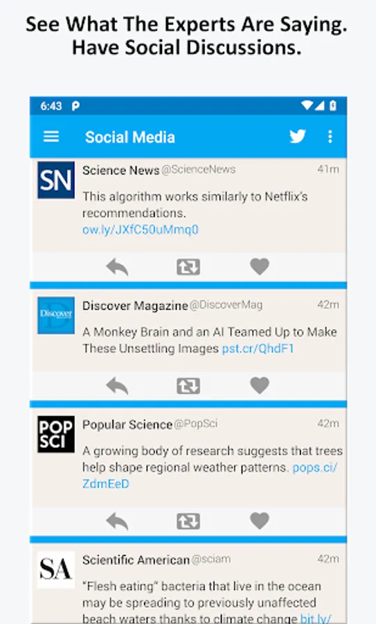 -- Discussion feed that aggregates news sources, and personalities from the Science world into a single list of tweets, so you can hear what everyone has to say and respond to them in real-time.