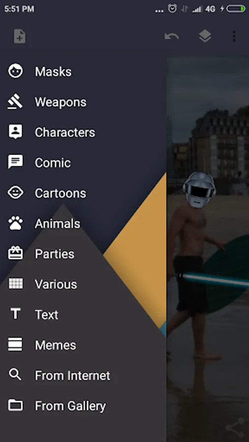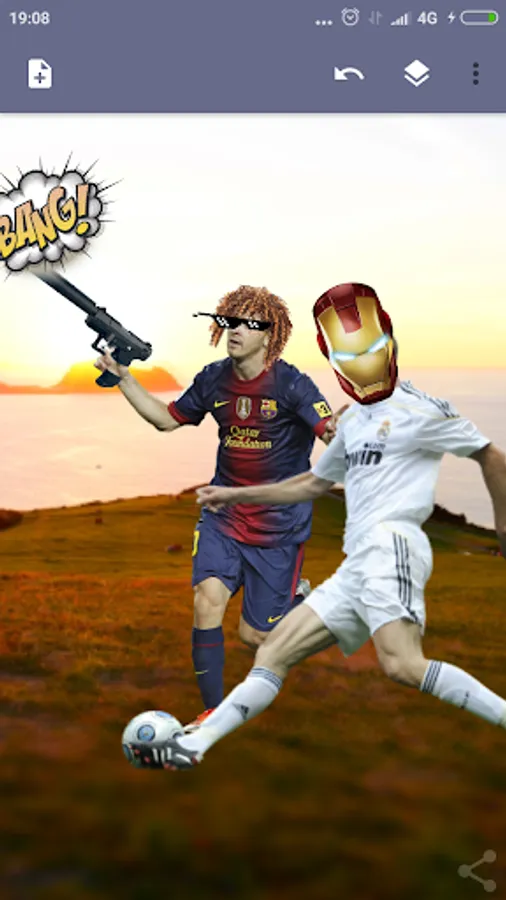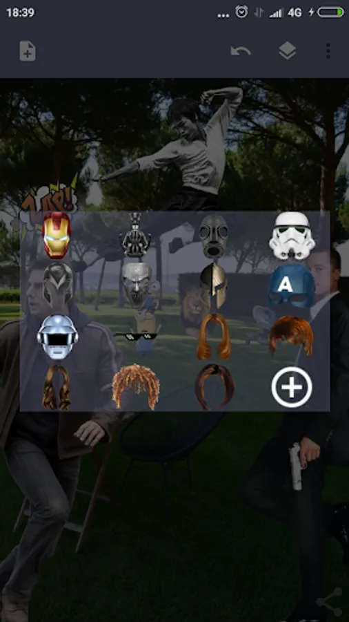 You can add to your photos texts, memes and all kind of images, from the proposed of the app (animals, weapons, masks, cartoons, famous characters, comic actions, etc) or include them directly from Internet.